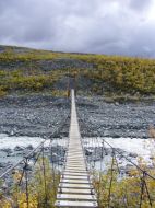 Der Matanuska Gletscher! Den muss man nicht nur gesehen haben, sondern ihn auch besteigen! Und das ist möglich. Für 15 $ (Senior Citiziens wie ich zahlen nur 12,50 $!) und dann kann man bis ans Gletscherende mit dem Auto heranfahren. Man muss zwar einen Zettel unterschreiben, auf dem man erklärt, das volle Risiko selbst zu tragen, aber man ist ja mutig und unterschreibt, ohne es wirklich gelesen zu haben, so sehr reizt es, diese Ding näher kennenzulernen und zu erklimmen! Hinab und über die wackelige Holzbrücke.