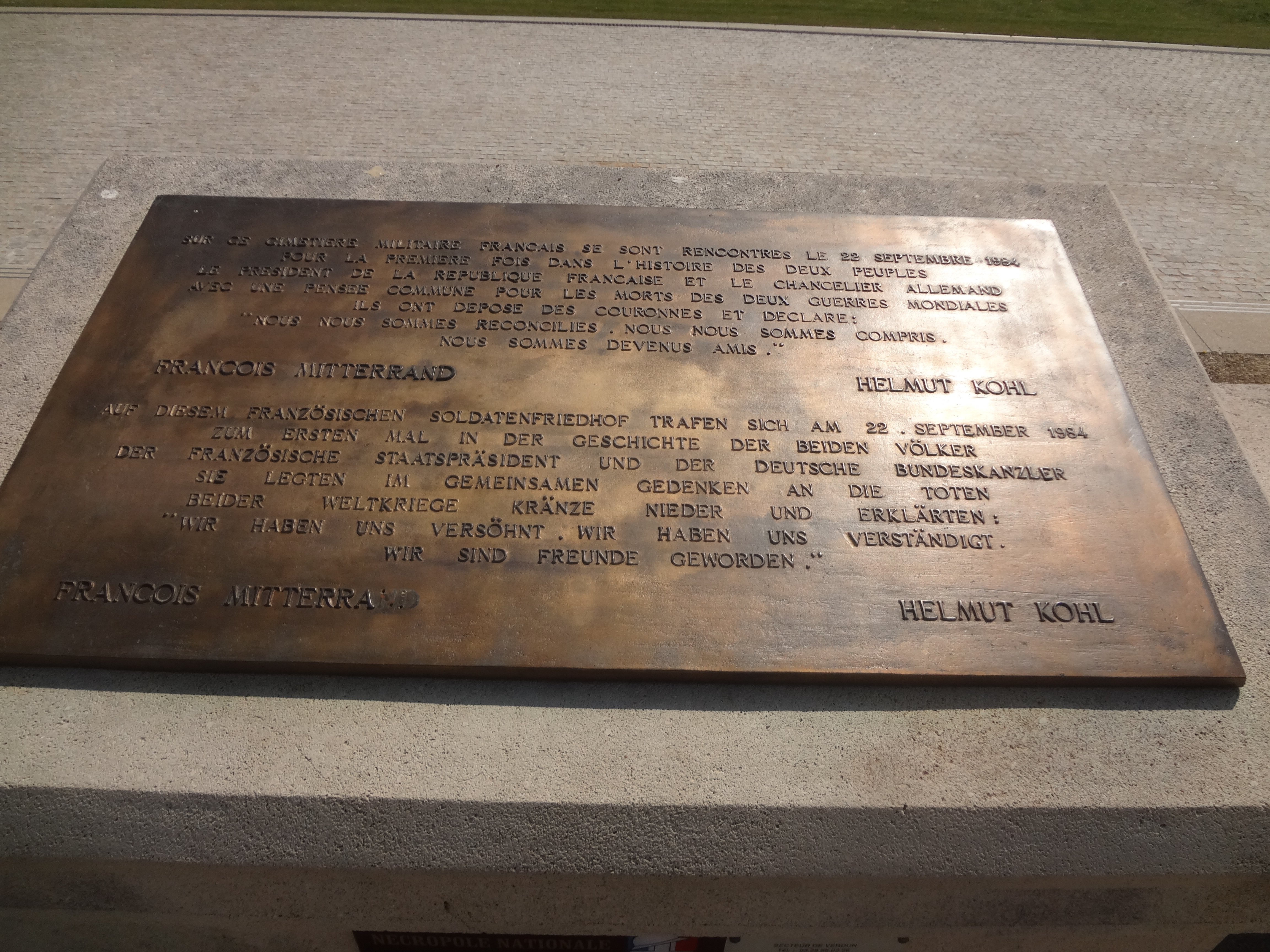 Dann habe ich mir auch das Denkmal angesehen, in dem die Gebeine von über 130.000 Toten beigesetzt worden sind. An diesem Denkmal haben Francois Mitterrand und Helmut Kohl 1964 eine gemeinsame Gedenktafel angebracht, sich bei der Hand genommen und sich gegenseitige Freundschaft geschworen.