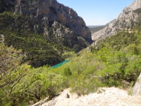 Am Ende der Schlucht leuchtet der azurblaue Stausee Lac de Sainte Croix herauf.