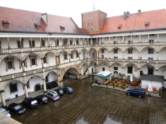 Der wunderschöne Arkadenhof italienischer Baumeister mit zwei Besonderheiten, die dem polnischen Wetter angepasst wurden: