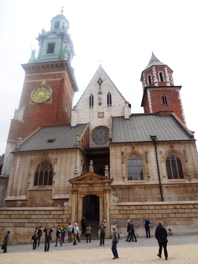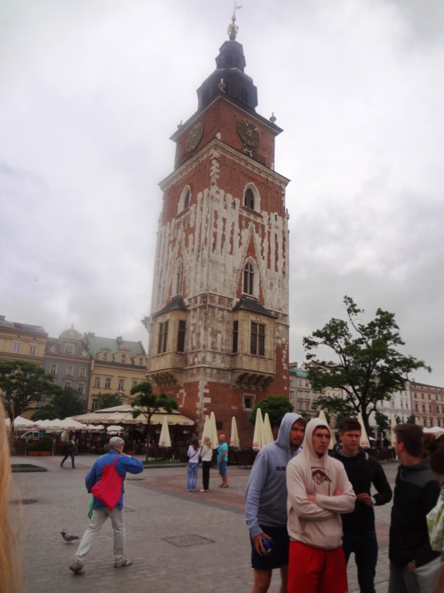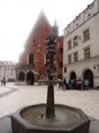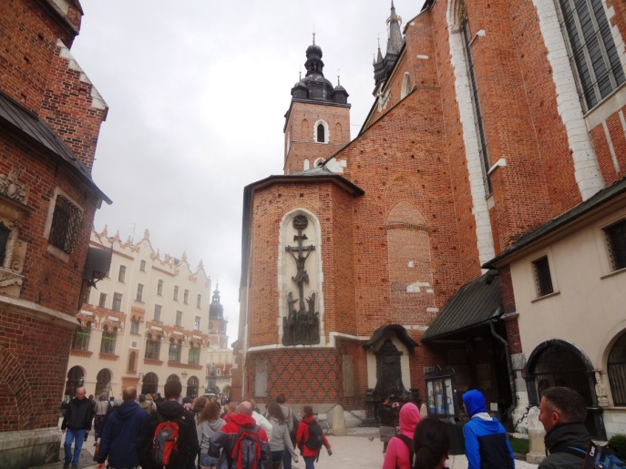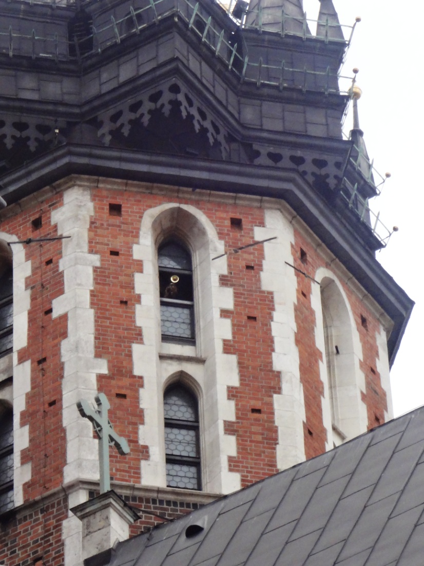Sie zeigte uns den Turm der Kathedrale wo aus dem oberen Fenster jeden Augenblick ein Trompeter auftauchen und ein Lied spielen würde: und das tat er denn auch und wir klatschen richtig Beifall, wofür er sich mit einem kräftigen Winken bedankte. Die dahinter steckende Geschichte habe ich zwar nicht ganz mitbekommen, doch er bläst in alle vier Himmelsrichtungen, um den König, die Adligen, die Kaufleute und zum Schluss die Armen zu begrüßen.