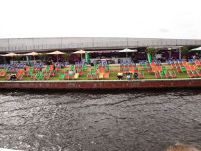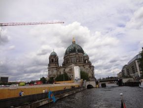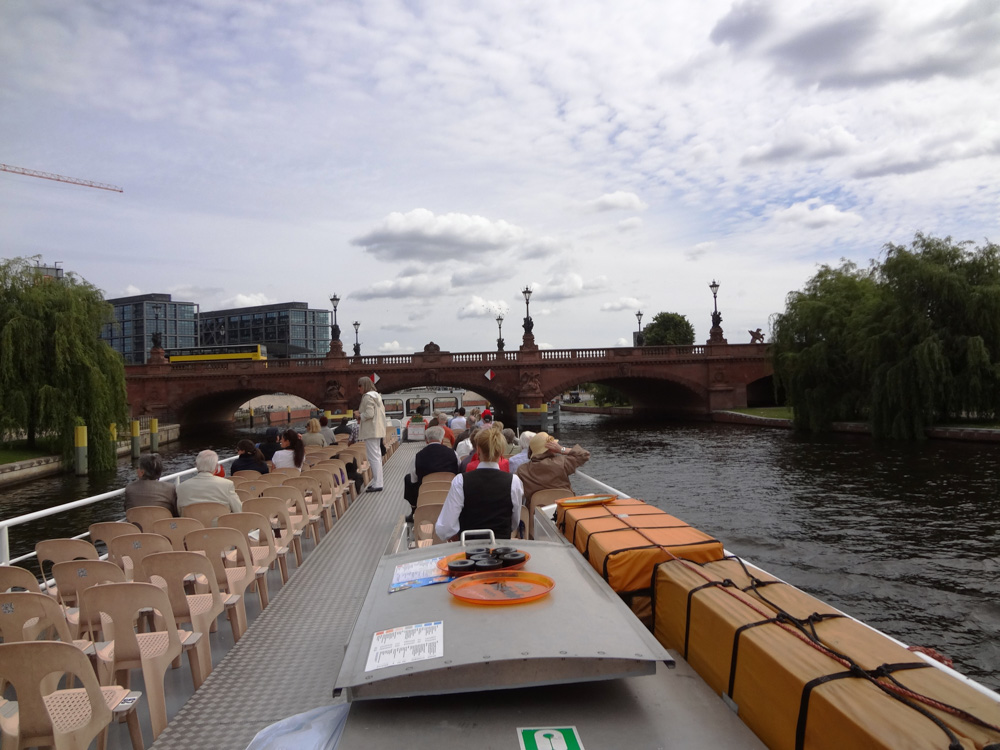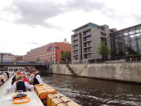 Der Sonntagmorgen begann nicht ganz so früh, sondern wir mussten erst um 9 Uhr am Bus sein, so dass ich vor dem Frühstück sogar noch ein paar Zeilen in dieses Reisetagebuch schreiben konnte. Wir fuhren dann in die Nähe des Schloss Charlottenburg, von wo aus wir eine Spreefahrt machten. Der Himmel war leicht bewölkt, und ein kleiner Wind wehte, so dass es ganz gut war, meinen neuen Sweater mitgenommen zu haben, den ich ja immer ausziehen konnte, wenn es einmal zu warm wurde. Die Fahrt selbst war nicht so berauschend, wie ich es mir vorgestellt hatte und auch Frauke war nicht vom Hocker gerissen, wie man so schön sagt, denn der Kommentator auf dem Schiff, der die Strecke erläuterte, schien ein Architekturstudent zu sein, denn er erzählte bei jedem Gebäude und jeder Brücke, von welchem Architekten es bzw. sie errichtet worden war (als ob uns das nun wirklich interessiert hätte und wir es uns merken würden). Nur zum Kanzleramt erzählte er so gut wie gar nichts. Dafür wusste Frauke, dass man von der Privattoilette der Kanzlerin direkt auf die Spree schauen kann (das hatte sie einmal in einem Fernsehbericht gesehen). Imposant war einzig, durch das Regierungsviertel zu schippern, denn was so rund um dem Reichstag an gewaltigen Gebäuden errichtet worden ist, ist schon beeindruckend.