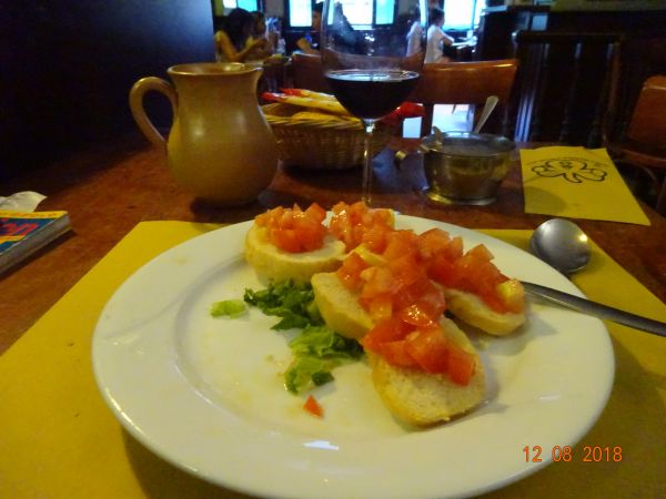 DSC02531 Bei meinem kleinen Rundgang kam ich an diesem netten Restaurant vorbei und entschloss mich, hier zum Essen zu bleiben. Zunächst mein obligatorisches Bier zum Durstlöschen, doch dann kommt auch schon der Wein… DSC02533…und meine geliebte Bruschetta und dann mein HauptgerichtDSC02534 (weiss gar nicht mehr, was es war. Irgendwas mit Huhn.)