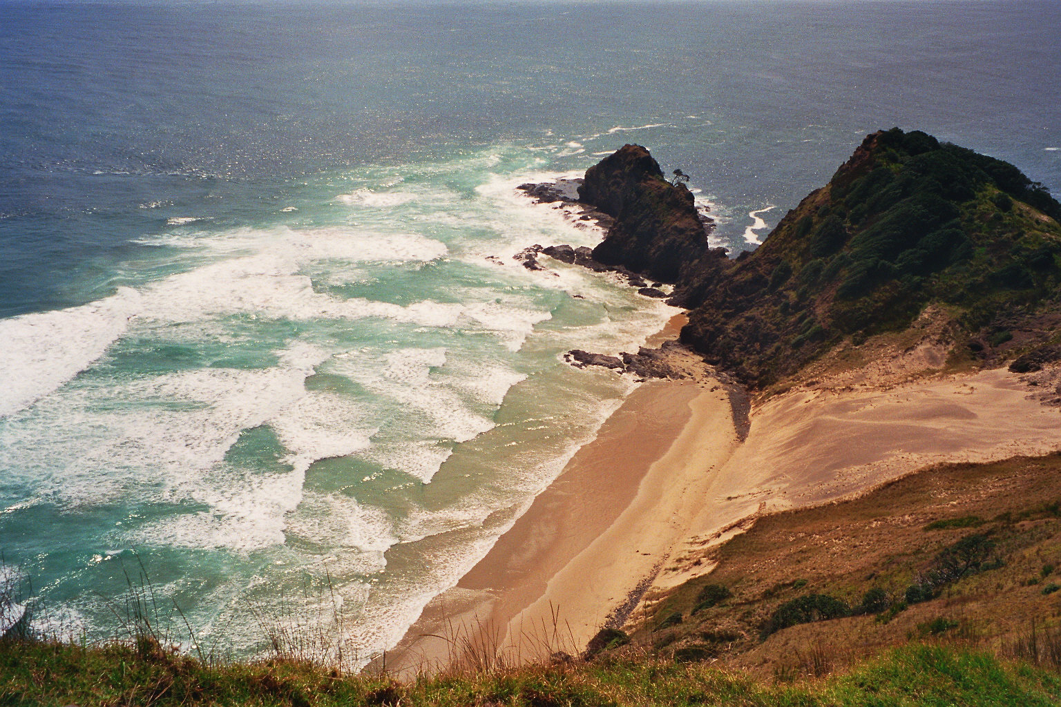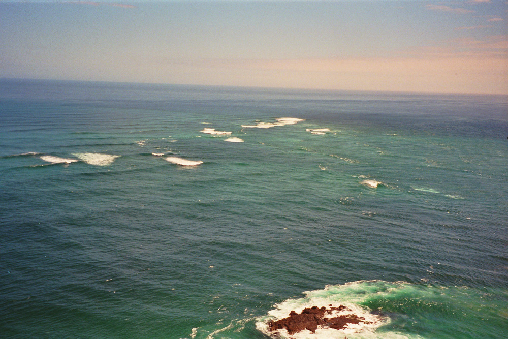 Man steht 165 m über dem Meer (beim Leuchtturm) und sicherlich 200 m bei der Wetterstation. Vorne sieht man, wie der Pazifik und die Tasman-See aufeinander stoßen.